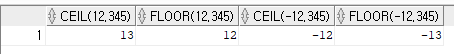 select ceil(12.345), floor(12.345), ceil(-12.345),floor(-12.345) from dual;