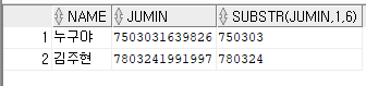 * 부분문자열 : substr (컬럼명|문자열, 1부터 시작하는 인덱스,글자수)