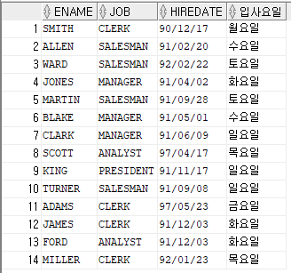 ex) emp 테이블에서 사원의 이름, 직업, 입사일, 입사 요일을 출력