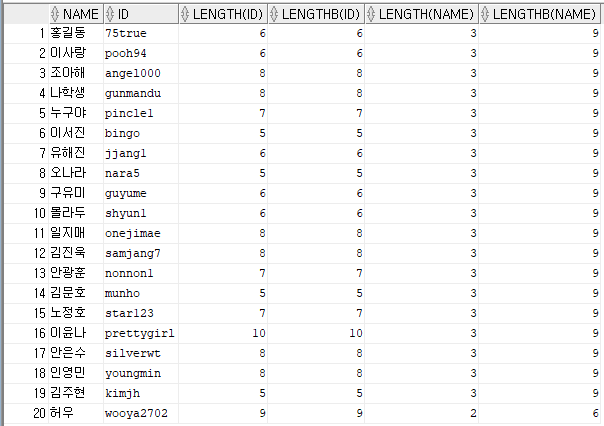 select name, id, length(id), lengthb(id), length(name), lengthb(name) from student;