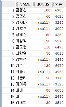 ex) 교수의 이름 연봉 출력. 연봉 : 급여*12 + 보너스. 보너스가 없는경우는 보너스는 0으로 처리함.